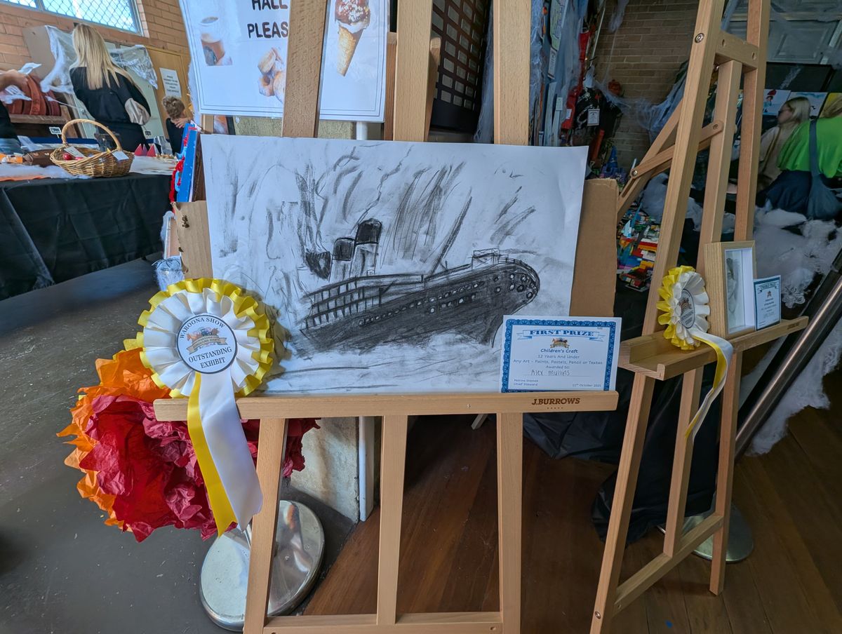 Congratulations to Alex Mullins (Year 6) who was awarded ‘Most Outstanding Exhibit’ in the Children’s Hall at the 2025 Waroona show for his charcoal drawing of the Titanic.