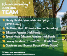 If you are interested or know of someone who would be interested please refer to our website for more information by clicking the link below: www.frederickirwin.wa.edu.au/our-school/employment